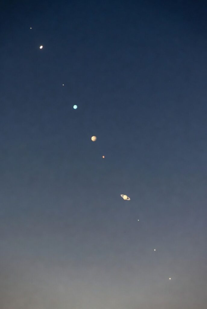 განთიადისას ვენერა, მარსი, იუპიტერი, სატურნი, ურანი და ნეპტუნი ეკლიპტიკის გასწვრივ გამოჩნდებიან — იმ უხილავ გზაზე, რომელსაც მზე და მთვარე ცაზე მუდამ მისდევენ. ისინი კოსმოსში სრულყოფილ ხაზად არ განლაგდებიან, მაგრამ დედამიწიდან მათი ერთმანეთთან სიახლოვე ცას ერთიან, ჰარმონიულ პანორამად აქცევს — თვალისთვის შთამბეჭდავს..